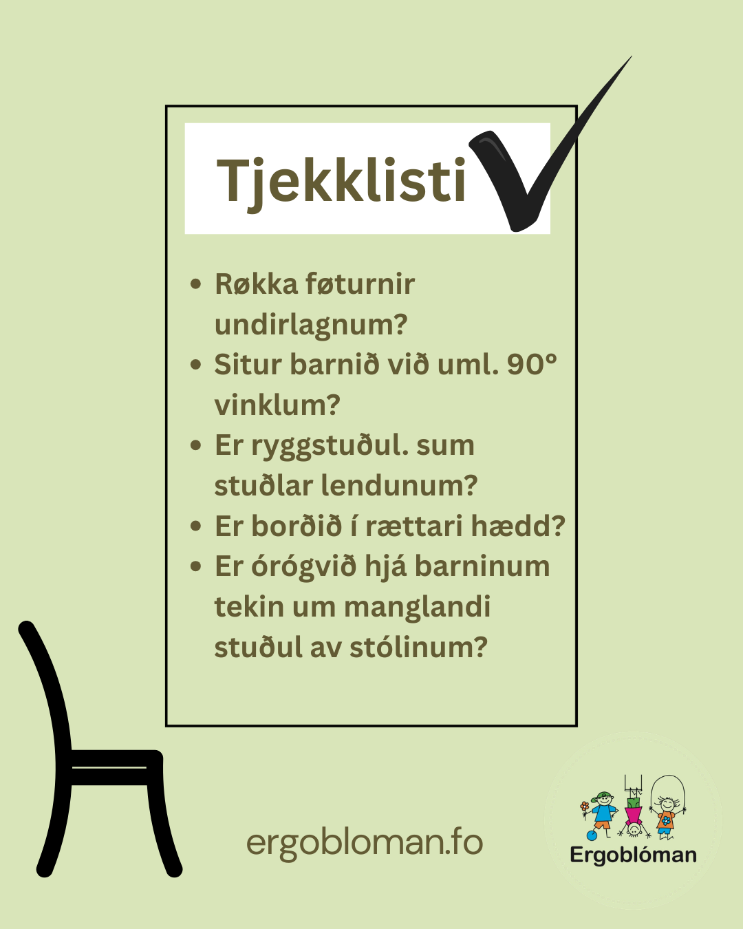 Vitsti tú av, at børn eiga at hava stól, sum stuðlar rygginum og stuðlar fótunum?